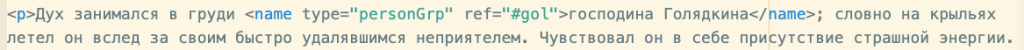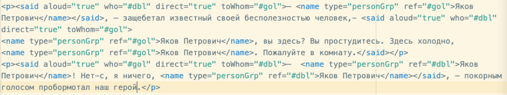 We all know that people can be referred to in many ways—by a first name (its full and short versions), a last name, a nickname, or a combination of these. Russian language adds to this list with patronymics and a multitude of diminutives. To avoid having our processing tools get lost in all these options, and because we want to deliver concise results, we also include an attribute “ref” to <name> tags. “Ref” contains a unique identifier (xml:id) created for each character in the Dostoevsky’s tale: “#gol” for Goliadkin, “#pet” for Petrusha, Goliadkin’s servant, “#ko” for Klara Olsuf’evna. If you scroll through our encoding of The Double, you will see that Goliadkin is always marked as “#gol,” whether he is referred to as Goliadkin, Iakov Petrovich, or Goliadkin the First. For The Double in particular, a unique identifier should help the software to differentiate between Goliadkin and his double, who have the same name. Just look at this conversation between the two of them: