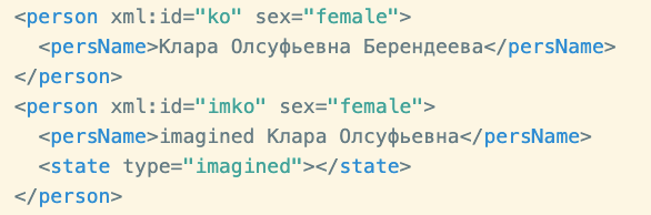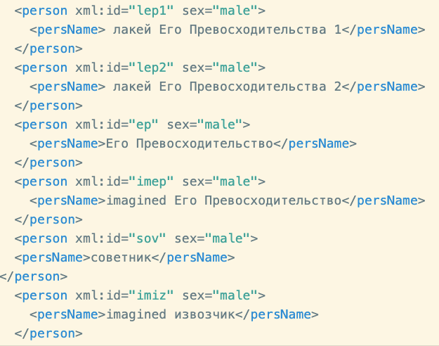 Since we wanted both the software and everyone who might use our encoding to know what character stands behind each id, at the bottom of the file we created name lists for all the “fictional characters,” “historical characters,” and “fictionalnonDostoesvky” characters. All these lists include separate entries for every character or historical figure mentioned in the text; they contain their full name, occupation, sex, and at times a brief additional biographical or bibliographical comment. My personal favourites in these lists are imaginary characters—real characters with whom Goliadkin has his imaginary disputes: #imko (“imagined Klara Olsuf’evna”), or #imdbl (“imagined double”).