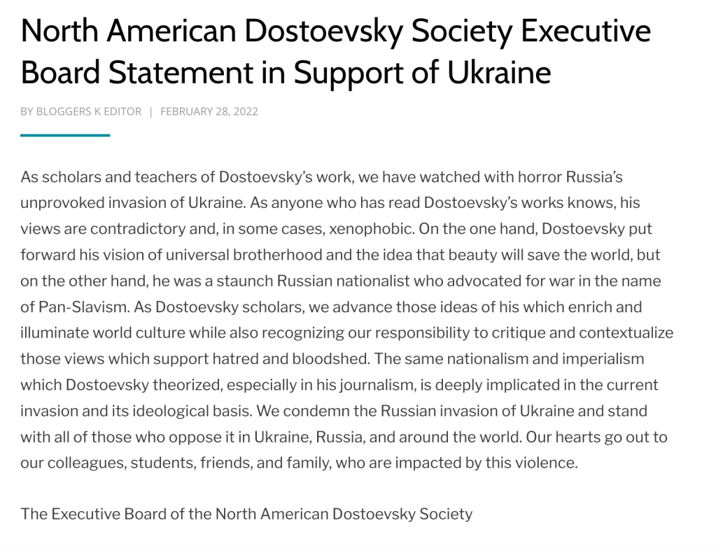 We paused after our last blog entry on Digital Dostoevsky in response to the Russian invasion of Ukraine and its devastating consequences. As Dostoevsky scholars we have been reflecting on our field together with other Russianists and Slavists and considering a way forward that will be more critical towards the accepted paradigms of our discipline. As President and Vice-President of the North American Dostoevsky Society, Katia and I drafted a statement in support of Ukraine, which we feel also applies in all other areas of our work. After consultation with the other team members, we post it here: