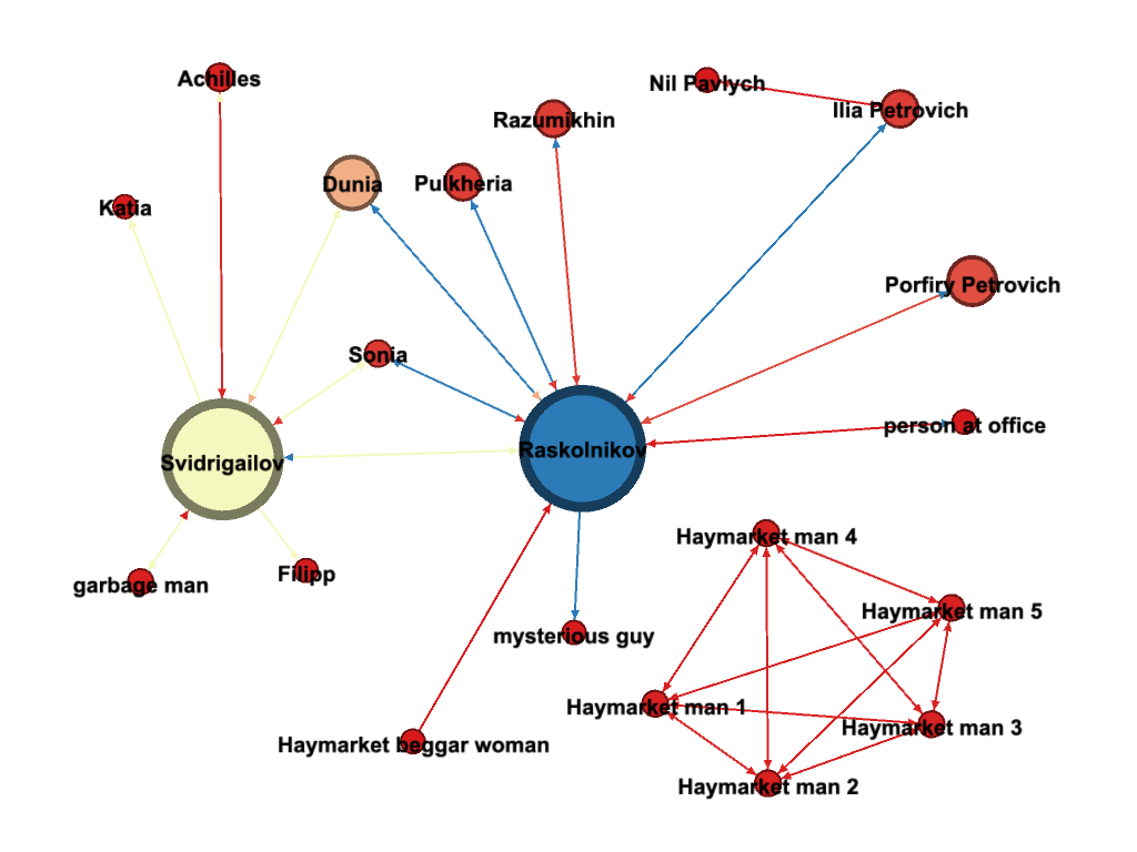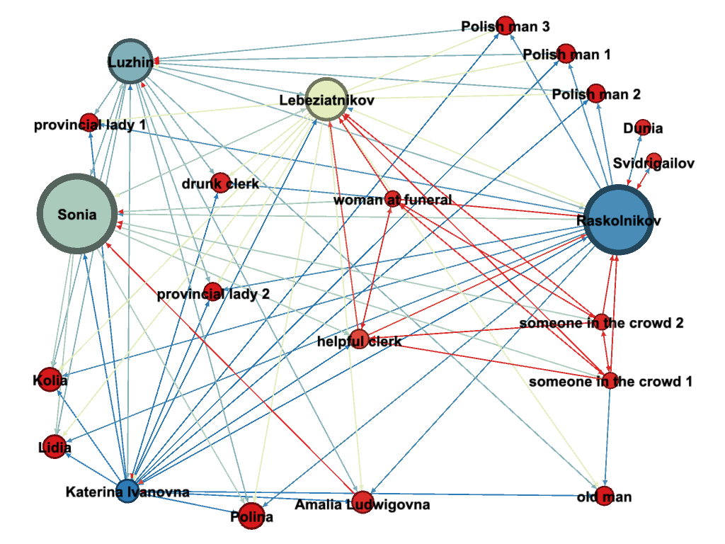 One of the first things we realized when working on the talk was that we now have the data capability to produce networks of each section of the novels, so that not only can we produce speech network analysis of each novel as a whole but we can also look at how the networks change over time. A particularly rich subject for this kind of analysis is Crime and Punishment. While a couple of scholars (Benamí Barros Garcia and Chloë Kitzinger) have produced network analyses of that novel, neither used encoded speech as their source for network connections, and neither created networks of multiple different parts of the novels. Our conference presentation, in which we looked at networks of different parts of Crime and Punishment as well as The Idiot and Demons, was largely exploratory, but this winter we worked on a more sustained and systematic analysis of Crime and Punishment for a book chapter on “Dostoevsky and Computational Text Analysis” we’re writing for a forthcoming Routledge Companion to Dostoevsky, edited by Sarah Hudspith and Sarah J. Young.