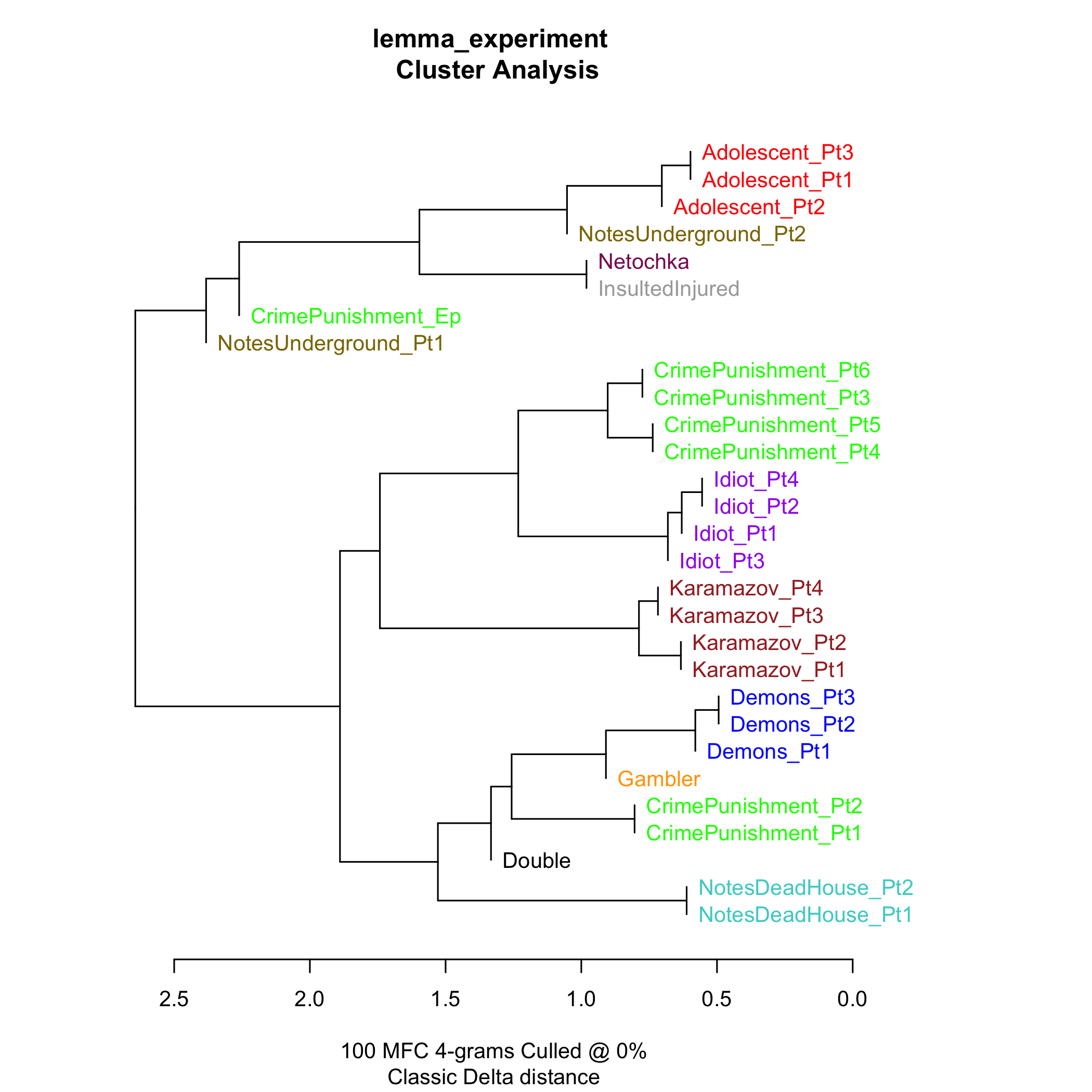 We used a plain text corpus of Dostoevsky’s novels and novellas that we had downloaded and cleaned from Project Gutenberg. We deliberately chose novels and novellas that were not, for example, epistolary (as in Poor Folk) or did not have other standout formal features that might mark them as different. We also wanted to make sure that the texts would be of a similar length, so we cut each longer novel into its parts and also omitted shorter works such as “A Weak Heart” or “The Dream of a Ridiculous Man.”